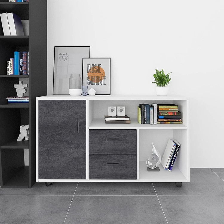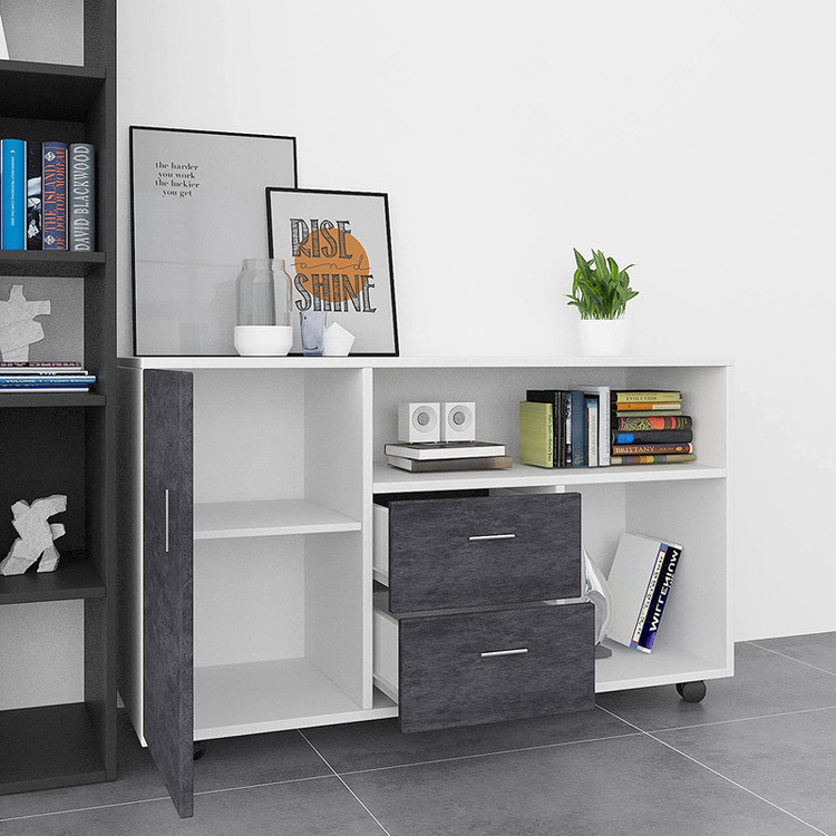 کتابخانه مدل IKE585 جنس روکش از ملامینه میباشد و دارای دو عدد کشو با ریل ساچمه ای با کیفیت و درب با لولای آرام بند با کیفیت و دارای چهار عدد چرخ ترمز دار مقاوم و این کالا از استحکام و مقاومت بالایی برخوردار است.