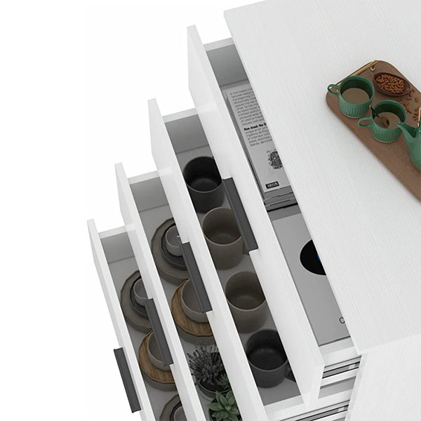 دراور شش کشو مدل IKE365 جنس روکش ملامینه ضد خش میباشد و کشو ها با ریل ساچمه ای با کیفیت دستگیره فلزی مستحکم در سه رنگ گردویی ، سفید و آنتیک طلایی زیبا و شکیل میباشد.