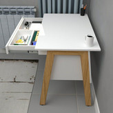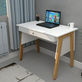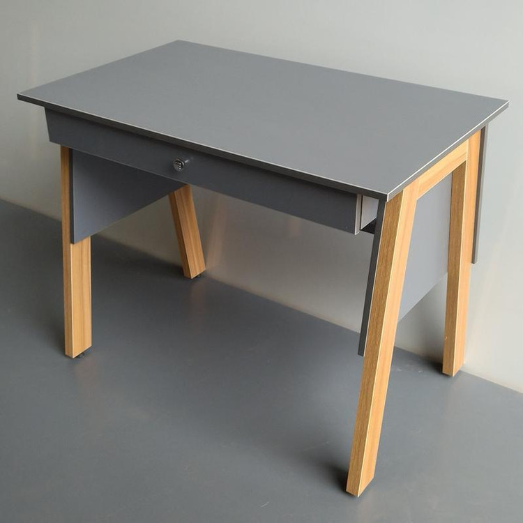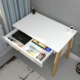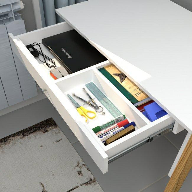 میز تحریر ، در ابعاد ۶۰×۱۰۰ ، دارای کشو با مقسم داخلی ، تولید شده از متریال تمام ام دی اف که با استفاده از یراق آلات باز شونده ، به صورت دمونتاژ ارائه میگردد .این میز در دو رنگ سفید _ گردویی و طوسی تیره _ گردویی ارائه میگردد ، رنگ پایه در هر دو حالت گردویی میباشد .
