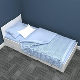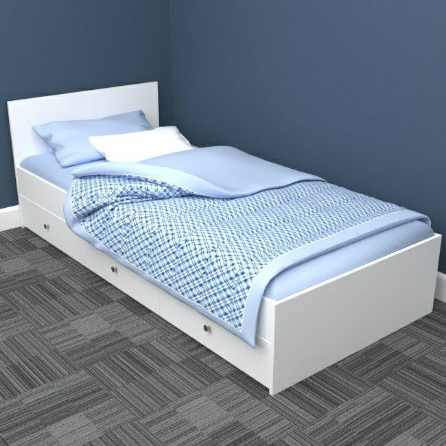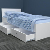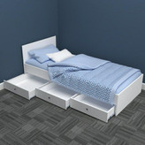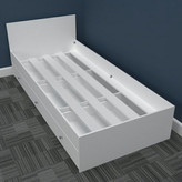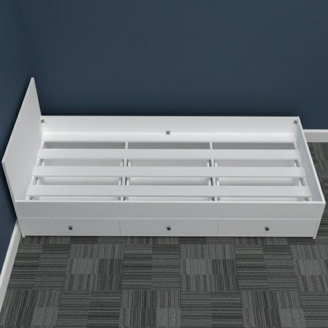 تخت تک نفره مدل B-101 با استفاده از متریال ام دی اف سفید برفی و نوار پی وی سی ۲ میل ساخته شده ، دارای سه کشو به عمق ۷۰ سانت، عرض ۵۹ سانت و ارتفاع جعبه کشو ۱۲ سانت که با ریل ساچمه ای سه تیکه باز و بسته میشود ، اتصالات به کار رفته از نوع بست پروانه است که در عین داشتن استحکام بالا ، در باز و بسته کردن تخت نیز سهولت ایجاد کرده است .