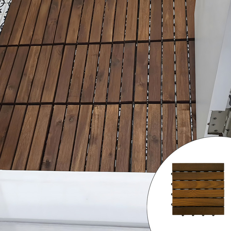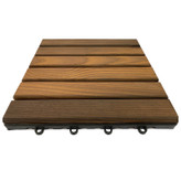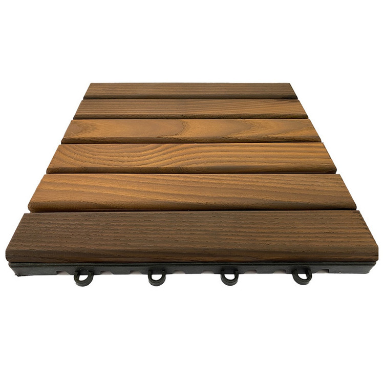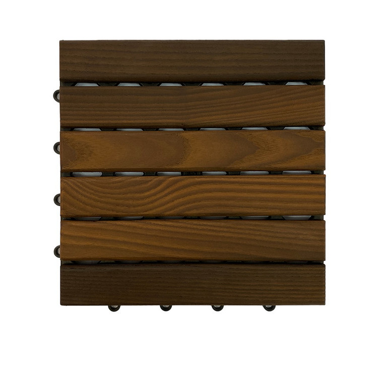 این تایل ها مناسب استفاده در محیط های مرطوب و فضای باز مانند تراس، روف گاردن، پوشش دور استخر، سونا و... می باشد. ابعاد تایل ها 30در 30 در 3 سانتیمتر می باشد. هر تایل شامل 6 تخته می باشد که برای ارگونومی بهتر، لبه های هر کدام، ابزارزنی شده اند.نصب تایل ها کنار هم به آسانی با کلیک انجام می گیرد.چوب های ترمو بکار رفته در این تایل ها، فاقد ترک و گره می باشند. قابلیت شست و شو دارند و در برابر انواع پوسیدگی و قارچ مقاومند و در نتیجه دوام بالایی دارند. استفاده از گونه اش (ون یا زبان گنجشک) که دارای دانسیته (تراکم) بالا و نقوش جذاب می باشد، خواص مکانیکی بسیار بالایی را نسبت به کاج های متداول روسی ایجاد کرده است. این تایل ها انعطاف پذیری بالا در ترکیب شدن با متریال های دکوراتیو دیگر مانند چمن مصنوعی، سنگ ها و... دارند. چوب های ترمو بکار رفته قابلیت رنگ پذیری دارند و باید برای محافظت از اشعه فرابنفش ( UV) نور خورشید، از رنگ های مناسب استفاده گردد.