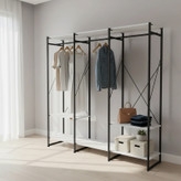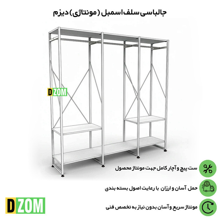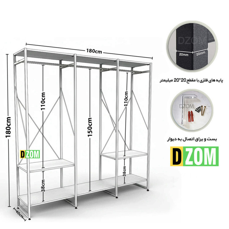 رگال لباس دیزم DZom مدل مونتاژی RGL_180×180_W محصولی مونتاژی، سبک، شیک و در عین حال جذاب و کارآمد از سری تولیدات دیزم میباشد. مشتری گرامی توجه نمایید محصولات برند دیزم (شماره ثبت 414013 اداره ثبت علائم تجاری) با کیفیت و بسته بندی اصلی تنها توسط فروشنده رسمی دیزم در دیجیکالا عرضه میشود، لطفاً از خرید کالای تقلبی از سایر فروشندگان خودداری فرمایید. این محصول بصورت سلف اسمبل (مونتاژی) تولید شده است. این جالباسی حمل و نقل آسان و هزینه حمل مقرون به صرفه ای دارد. از پایه های فلزی با مقطع 20x20 میلیمتر و رنگ رویه الکترواستاتیک با ماندگاری و دوام بالا ساخته شده است. همچنین پایه های پیچی، قابلیت تنظیم نسبت به سطح زمین را دارد تا بهترین تراز جهت جلوگیری از تکان خوردن را ایجاد نماید. صفحات جالباسی از جنس MDF درجه یک برجسته طرح چوب به رنگ سفید می باشد. این محصول با طول 180cm، عرض 40cm و ارتفاع 180cm عرضه می شود. به این نکته توجه شود که تنوع رنگ انتخابی کالا تنها مربوط به رنگ پایه های فلزی میباشد. توصیه میشود جهت حفظ ایمنی و ثبات بیشتر، محصول در یک یا دو نقطه به دیوار پیچ گردد.(یراق اتصال داخل بسته بندی موجود است).