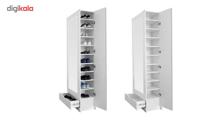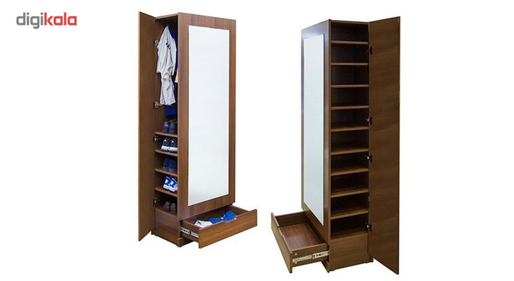 جاکفشی جالباسی پرند با طراحی بسیار شیک و چند منظوره مناسب برای قرارگرفتن در ورودی منازل است.آیینه قدی این محصول جلوه و کارایی بیشتری به آن بخشیده است و تولید شده از مرغوب ترین مواد اولیه و در سه رنگ سفید، قهوه ای تیره و قهوه ای روشن آماده عرضه به شما مشتریان عزیز می باشد.این محصول در عین سادگی فضای آراسته ای را به محیط شما ارایه می دهد. جا کفشی – جالباسی پرند دارای دو درب در کناره ها و یک کشو در پایین می باشد .در یک سمت فضایی برای آویز لباس و طبقاتی برای نگهداری کفش و کیف و البسه و.... در سمت دیگر تماما طبقاتی تعبیه شده است که فضای زیادی را به شما ارایه میدهد.جنس تمامی کمدها ورق ملامینه ضد خش و تمامی اتصالات الیت می باشد همچنین تمامی لبه های کار پی وی سی شده است.